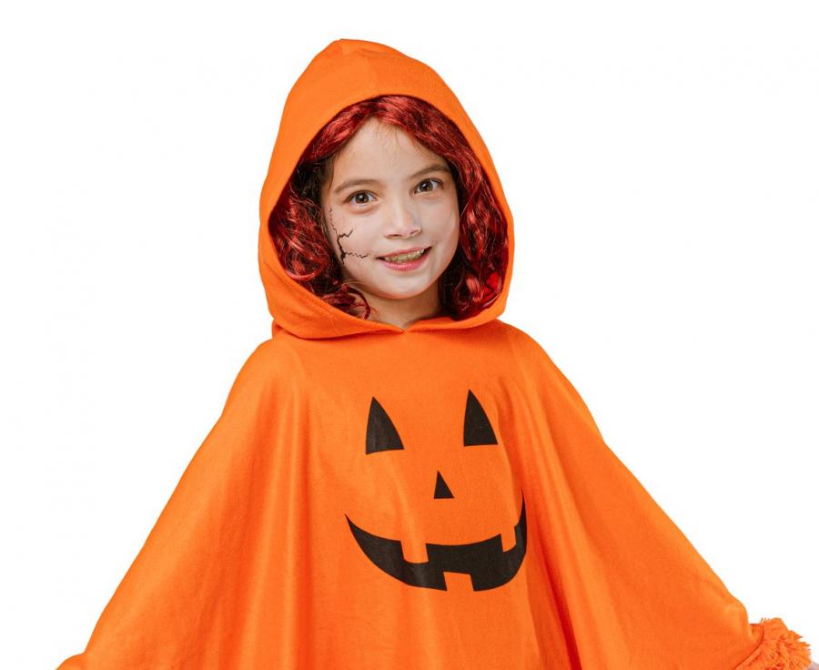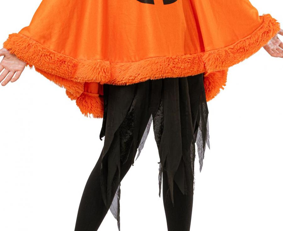Rozkošný a snadno nositelný kostým pro děti – pončo s kapucí ve tvaru dýně. Díky volnému střihu je pohodlné a padne většině dětí. Skvěle se hodí na Halloween, školní besídky, karnevaly nebo podzimní oslavy.